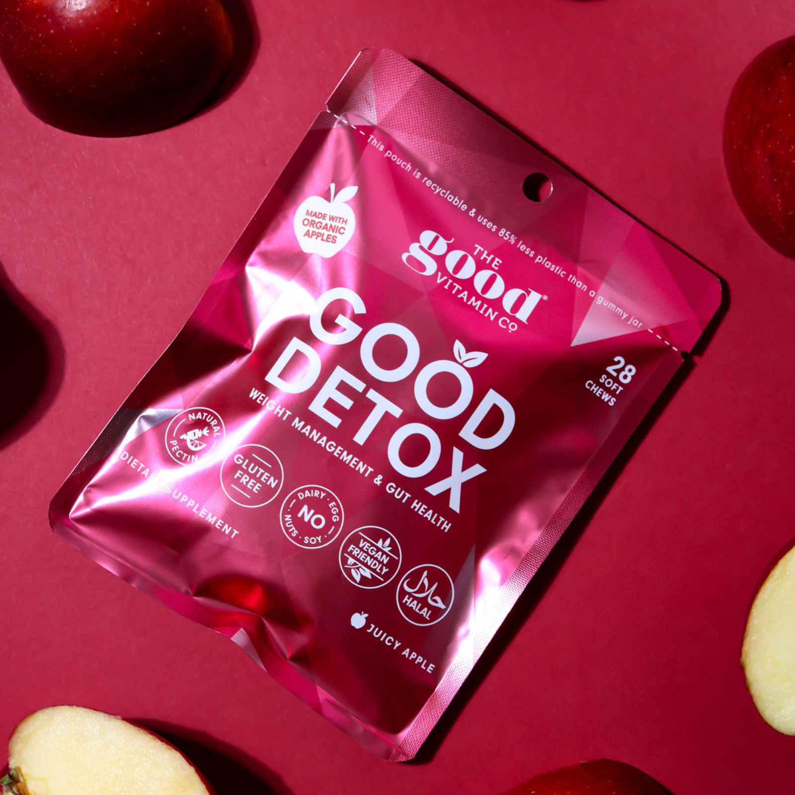 Detox Gummies bring the powerful health benefits of traditional apple cider vinegar in a delightful gummy form. These tasty supplements are designed to support your wellness journey while being mindful of a broad array of dietary needs, ensuring no one misses out on their daily boost of ACV. In just one pouch, these natural gummies encapsulate health-focused innovation that fits seamlessly into your daily life, offering a simple path to maintaining wellness. 100% natural apple flavoured soft-chews.
