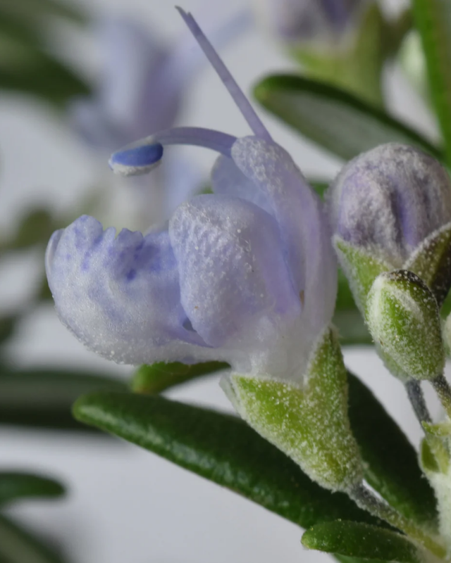 An evergreen shrub with fragrant, narrow leaves and white, pink, purple, or blue flowers. It is native to the Mediterranean region but can tolerate cooler climates. Its first recorded mention dates back 5,000 years and its medicinal reputation is well documented since then. With strong, vibrant depth as a culinary aromatic, its use as a tea to get the brain ticking is very popular historically and today. Its properties are also connected with muscular pain relief and as a tonic for skin and hair.